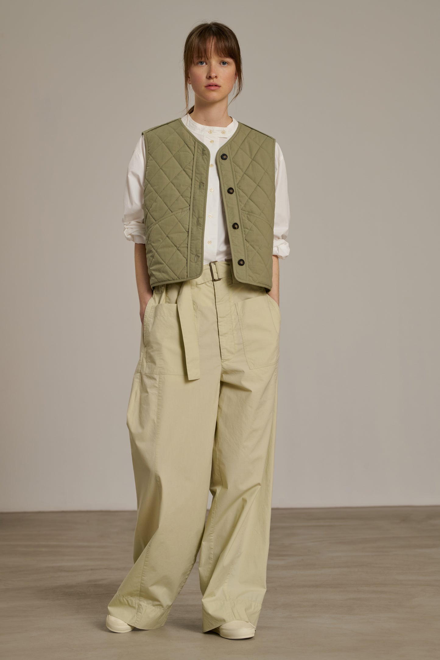 ULLA is a quilted cotton vest that can be layered as desired. It's lightly padded yet thin enough to be worn under a coat without hindering movement. Piping details accentuate the shoulders, patch pockets, and button placket.